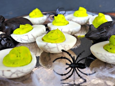Spider Devilled Eggs and Spiderweb Eggs - with yoyomax12 - Halloween Deviled Eggs - How to make devilled eggs with a cool black olive spider and how to get spider web patterns on your hard-boiled eggs. The ones made with the blueberries do ...